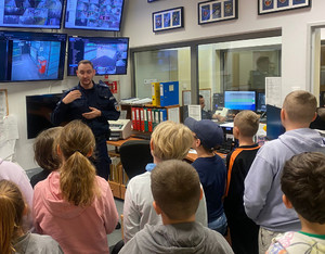 W kolejnej części zajęć dzieciaki poznały policyjne wyposażenie służbowe, a także miały możliwość wypróbowania działania takich sprzętów jak wykrywacz metali czy lusterko inspekcyjne używane przez policjantów z grupy rozpoznania minersko - pirotechnicznego. Po zakończonej pogadance zwiedzili „celę” oraz pomieszczenie oficera dyżurnego komisariatu, gdzie mogły się na własne oczy przekonać się jak działa system monitoringu w metrze, oglądając moment wejścia ich grupy do komisariatu.