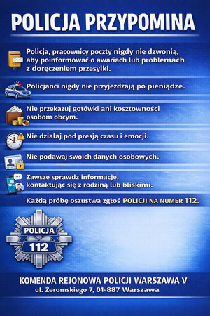 Nie zawsze wiadomo, kto naprawdę stoi po drugiej stronie słuchawki. 89-letnia mieszkanka Żoliborza padła ofiarą przestępcy podszywającego się najpierw pod pracownika poczty, a później pod policjanta. Oszust zdobył informacje o jej majątku, namówił do spakowania kosztowności i wyrzucenia ich przez okno, zapewniając, że wszystko zostanie jej zwrócone następnego dnia. Dopiero po fakcie kobieta zorientowała się, że została oszukana. Policja przestrzega i przypomina, jak łatwo stać się celem podobnych działań, oraz podaje zasady bezpiecznego postępowania w takich sytuacjach.