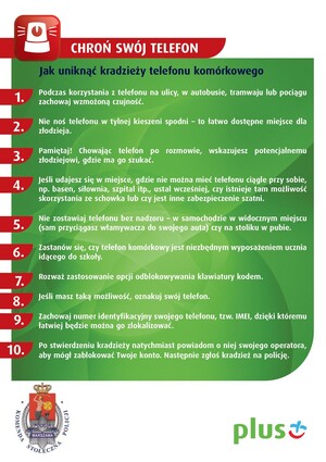 W trosce o bezpieczeństwo mieszkańców Warszawy stołeczni policjanci wspólnie z Plusem przygotowali kilka tysięcy ulotek z poradami, jak ustrzec się kradzieży telefonu komórkowego. Zainteresowani znajdą w ulotkach również adresy warszawskich jednostek policji, w których można złożyć zawiadomienie o kradzieży.
