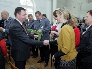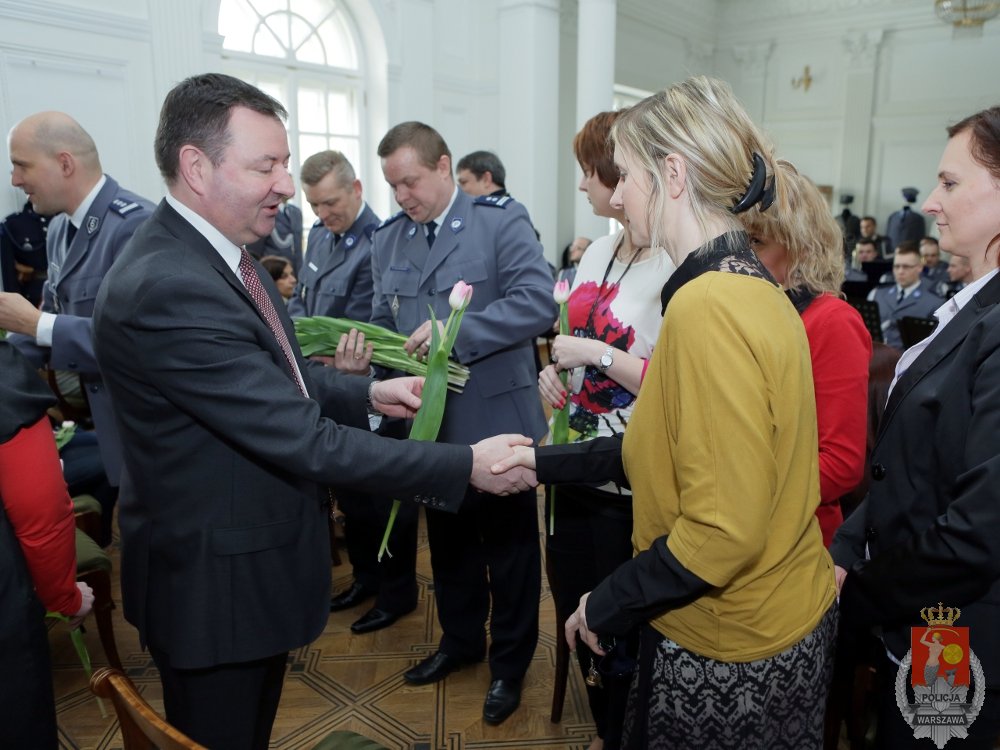 W imieniu kierownictwa Komendy Stołecznej Policji najlepsze życzenia wszystkim Paniom zatrudnionym w garnizonie stołecznym złożył, podczas spotkania w Białej Sali, Zastępca Komendanta Stołecznego Policji insp. Michał Domaradzki. Podziękował paniom za codzienny trud i życzył wielu sukcesów oraz spełnienia marzeń. Swoje najlepsze życzenia przekazał również ks. Kapelan Józef Jachimczak. Wszystkim zebranym Paniom trzej zastępcy komendanta wręczyli kwiaty.