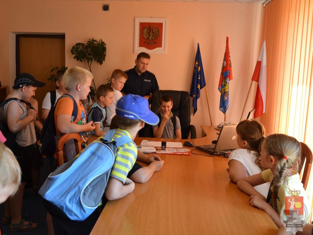 Oficer prasowy wołomińskiej komendy asp. szt. Tomasz Sitek w ramach prowadzonych przez Miejski Dom Kultury w Wołominie oraz Bibliotekę Miejską w Kobyłce zajęć „LATO W MIEŚCIE” zaprosił jej uczestników do odwiedzenia komendy. Na początek mili goście obejrzeli wyposażenie stanowiska kierowania wołomińskiej Policji. To tu dyżurny odbiera mnóstwo telefonów i to stąd kieruje wszystkimi patrolami.
