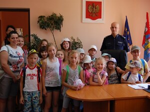 Ważnym punktem pobytu w komendzie była też wizyta w gabinecie Komendanta Powiatowego Policji młodszego inspektora Dariusza Krząstek. Pan komendant zaprosił dzieci do swojego pokoju, gdzie prawie każdy mógł zasiąść w „komendanckim” fotelu i choć przez chwilę poczuć się, jak „szef” dużej jednostki Policji.
