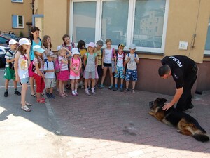 Niecodzienną atrakcją dla naszych maluchów było spotkanie z policyjnym psem. Policjant-przewodnik zaprezentował umiejętności swojego podopiecznego "Miśka", oraz opowiedział dzieciom do czego w Policji mogą służyć psy.