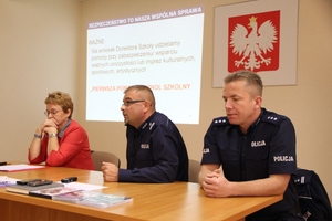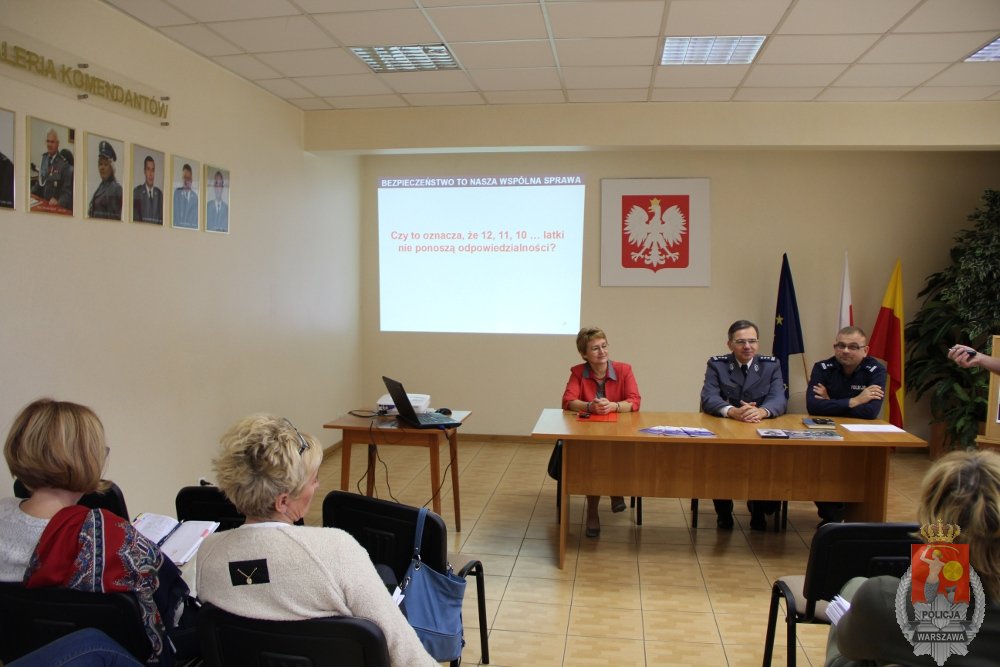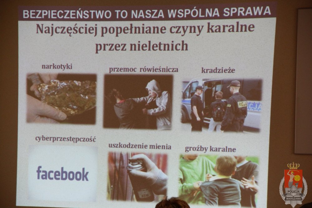 W dalszej części spotkania Komendant Komisariatu Policji Warszawa Bemowo mł.insp. Mariusz Oniszczuk oraz kom. Jarosław Grzywacz omówili czyny karalne najczęściej popełniane przez osoby nieletnie, proces demoralizacji, a także społeczny i prawny obowiązek powiadamiania właściwych organów w przypadku występowania wśród uczniów zachowań niezgodnych z prawem.