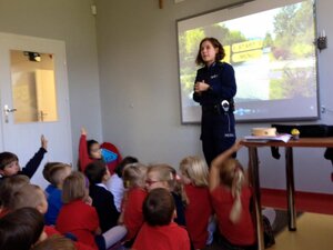 Policjantka z komendy Policji ze Starych Babic odwiedziła Niepubliczną Polsko-Brytyjską Szkołę Podstawową w Lubiczowie. Spotkanie miało na celu przypomnienie zasad bezpieczeństwa w ruchu drogowym. Funkcjonariuszka przypomniała dzieciom, jak prawidłowo i bezpiecznie poruszać się po drodze pieszo oraz o zasadach podróżowania samochodem. Najmłodsi dowiedzieli się, jak postępować w przypadku spotkania na swojej drodze obcej osoby.