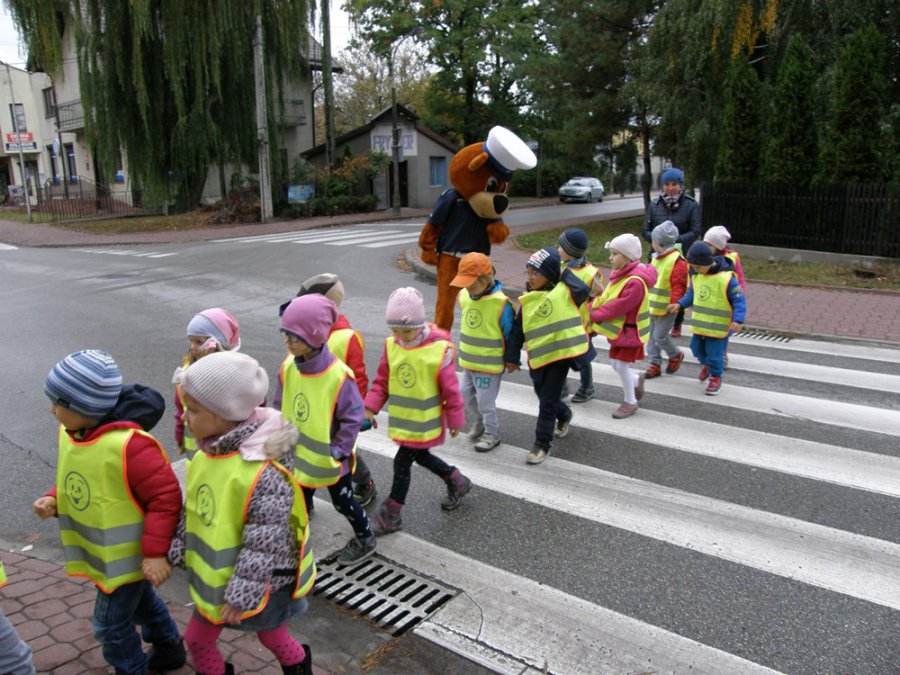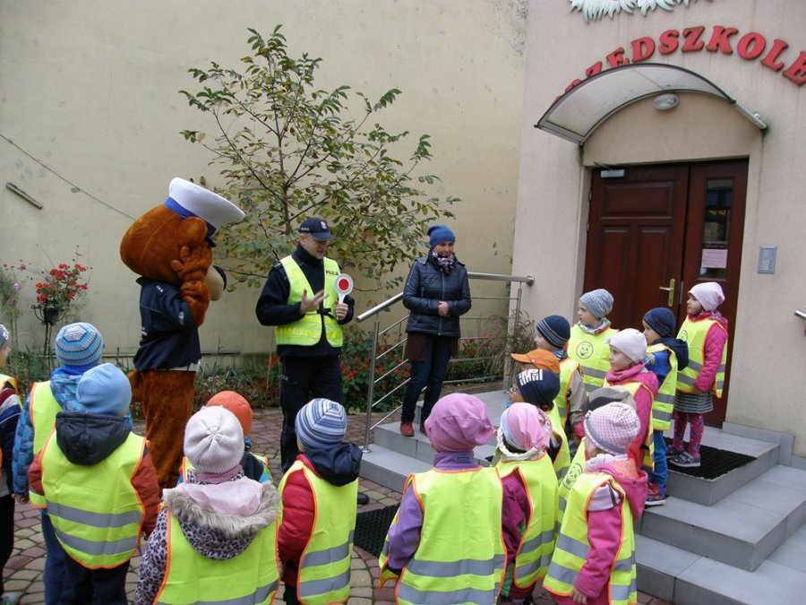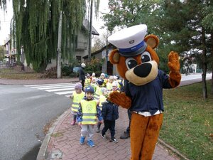 Podczas rozmowy z dziećmi policjant i miś Grodziś wyjaśniali na czym polega ostrożne zachowanie, szczególnie na drodze. Następnym elementem spotkania były praktyczne zajęcia na ulicy w pobliżu przedszkola. Mali uczestnicy lekcji w kamizelkach odblaskowych, pod opieką funkcjonariuszy, uczyli się jak prawidłowo przechodzi się przez jezdnię. Mamy nadzieję, że takie lekcje uświadomią dzieciom zagrożenia, na które będą zwracać uwagę także swoim opiekunom.