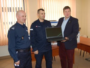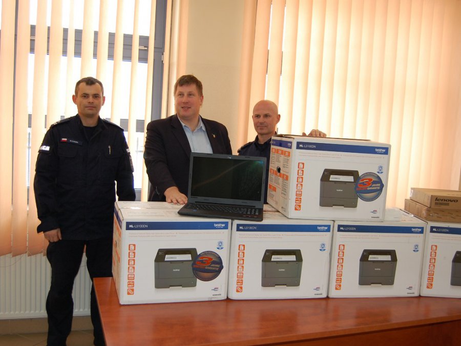 Burmistrz miasta Marki - Jacek Orych przekazał wczoraj mareckiej Policji zestaw urządzeń biurowych: cztery drukarki oraz dwa laptopy. To symboliczne zwieńczenie tegorocznej współpracy samorządu Marek z wołomińską i marecką Policją. W sumie samorząd Marek na rzecz lokalnej oraz powiatowej Policji przekaże w tym roku wsparcie warte 100 tysięcy złotych – zarówno w postaci sprzętu jak i dofinansowania do służb ponadnormatywnych. Sprzęt komputerowy z rąk burmistrza odebrał podinsp. Andrzej Oleksiak Komendant Policji w Markach w obecności Komendanta Powiatowego Policji w Wołominie podinsp. dr Marka Ujazdy.