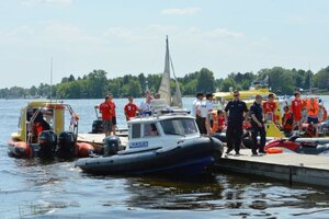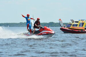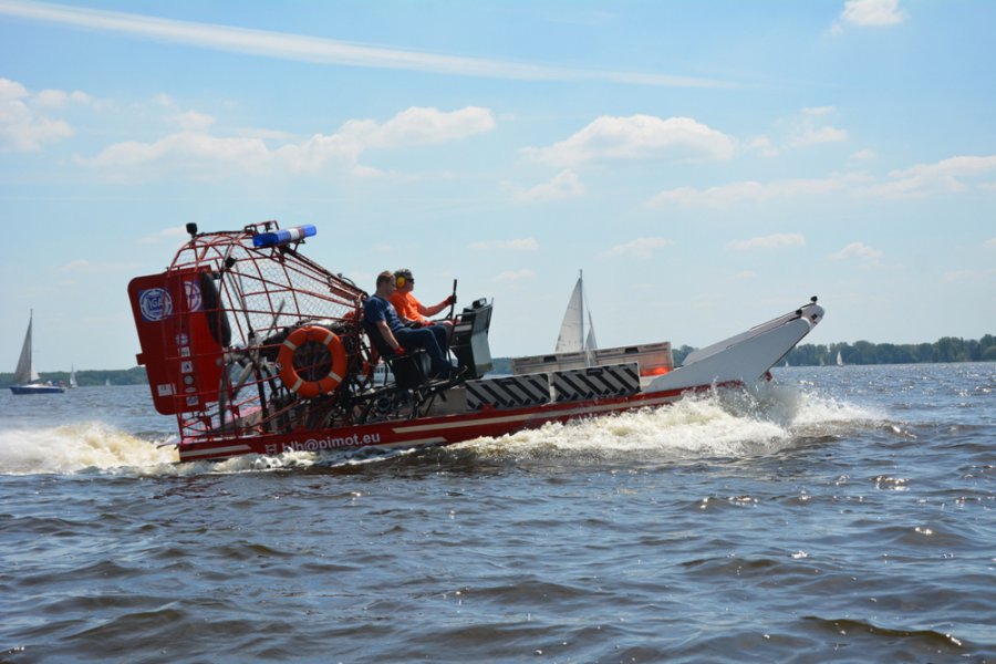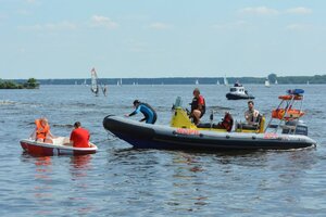 Drugim pokazem symulacji ratowniczej było zdarzenie na wodzie łodzi żaglowej z załogantami. W akacji ratunkowej brali udział ratownicy legionowskiego WOPR na łodzi motorowej oraz skuterze z platformą ratowniczą. Nie obyło się bez nurkowania za osobą, która znalazła się pod powierzchnią łodzi, gdyż nie posiadała na sobie kamizelki ratunkowej. Poszkodowaną osobę, wyciągniętą z wody, odebrała wodna karetka pogotowia i przekazała ją lekarzowi z Lotniczego Pogotowia Ratunkowego, którego śmigłowiec wylądował na lądowisku w Bazie LWOPR. Goście na własne oczy mogli zobaczyć jak wiele instytucji i osób zaangażowanych jest w ratowanie jednego życia ludzkiego.