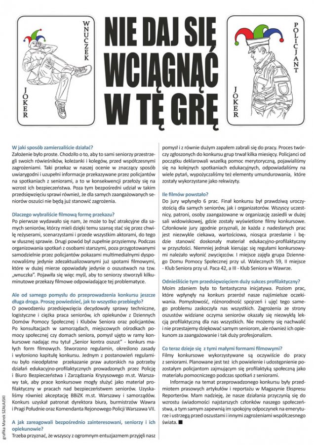 Problem oszustw dokonywanych metodą „na wnuczka” czy „na policjanta” wciąż jest aktualny i Policja cały czas stara się działać na rzecz ograniczenia tego rodzaju przestępczości. Najważniejsza w tym zakresie niewątpliwie jest profilaktyka i edukacja. Docieramy do osób starszych w przeróżny sposób i dosłownie staramy się być wszędzie. Komendant Komisariatu Policji w Wawrze kom. Robert Matusik może pochwalić się dość innowacyjnym pomysłem, jaki zrodził się i został zrealizowany w komendzie na Pradze Południe w minionym roku. A wszystko dla seniorów, w trosce o ich bezpieczeństwo.