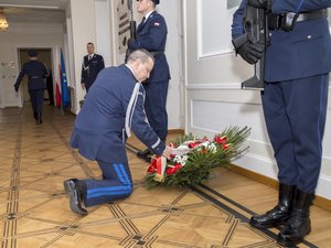 Punktualnie o 9.00 we foyer przed Białą Salą Pałacu Mostowskich nadinsp. Paweł Dobrodziej wraz z asystującymi mu zastępcami: insp. Krzysztofem Smelą, insp. Markiem Chodakowskim i Włodzimierzem Pietroniem uczcił pamięć Patrona insp. Mariana Stefana Kozielewskiego, składając kwiaty przed tablicą pamiątkową.