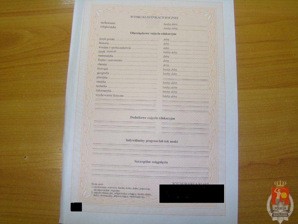 Policjanci z referatu ds. nieletnich z Ochoty uzyskali informację, że dwóch uczniów najprawdopodobniej zajmuje się podrabianiem świadectw szkolnych. Funkcjonariusze przystąpili do działania. Ustalili osoby, które mogły mieć związek z tym przestępstwem. Okazali się nimi dwaj 16-letni uczniowie jednego z liceów na terenie Ochoty. W ich mieszkaniach zabezpieczono sprzęt elektroniczny, którym się posługiwali, a także świadectwa szkolne in blanco z pieczęciami szkoły. Zabezpieczone komputery trafią do ekspertyzy w celu ustalenia ich pełnej zawartości.