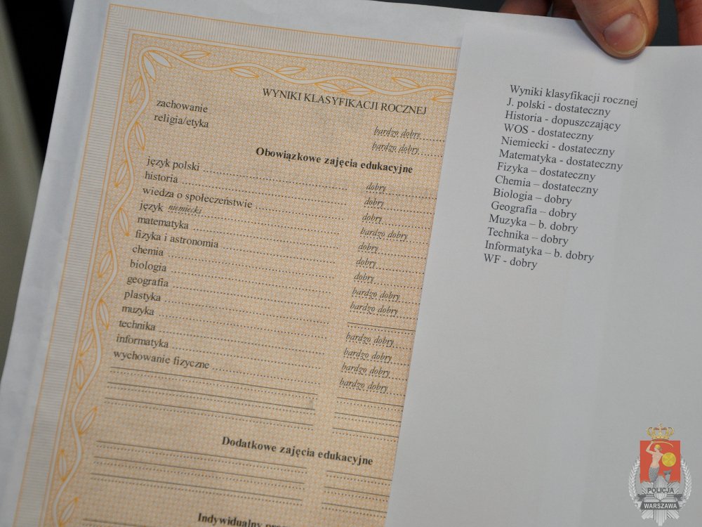 Policjanci z Ochoty zwalczający przestępczość wśród nieletnich zatrzymali dwóch 16-latków, którzy zajmowali się podrabianiem świadectw szkolnych. Wszystko wskazuje na to, że nastolatkowie spreparowane świadectwa sprzedawali uczniom, którzy bali się odpowiedzialności za osiągnięte wyniki w nauce przed rodzicami.