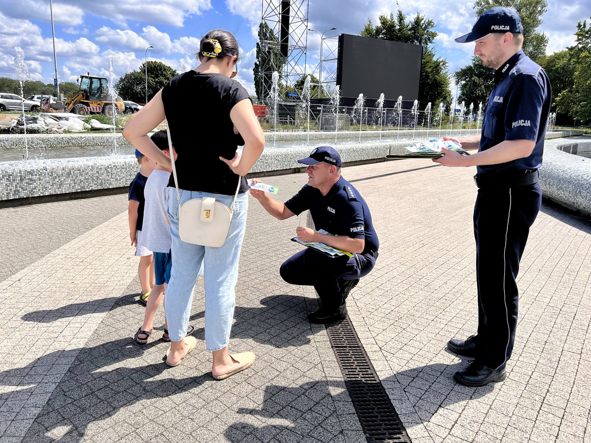Wakacje to czas beztroskiej zabawy, ale i wielu innych zagrożeń. Jednym z nich mogą być wysokie temperatury, szczególnie niebezpieczne dla najmłodszych. Policjanci uświadamiają dzieciom i doro-słym, aby nie przebywać na słońcu w najgorętszych porach dnia, zwracają rodzicom uwagę, aby zawsze pamiętali o swoich pociechach i nie pozostawiali ich w upalne dni w zamkniętych autach.