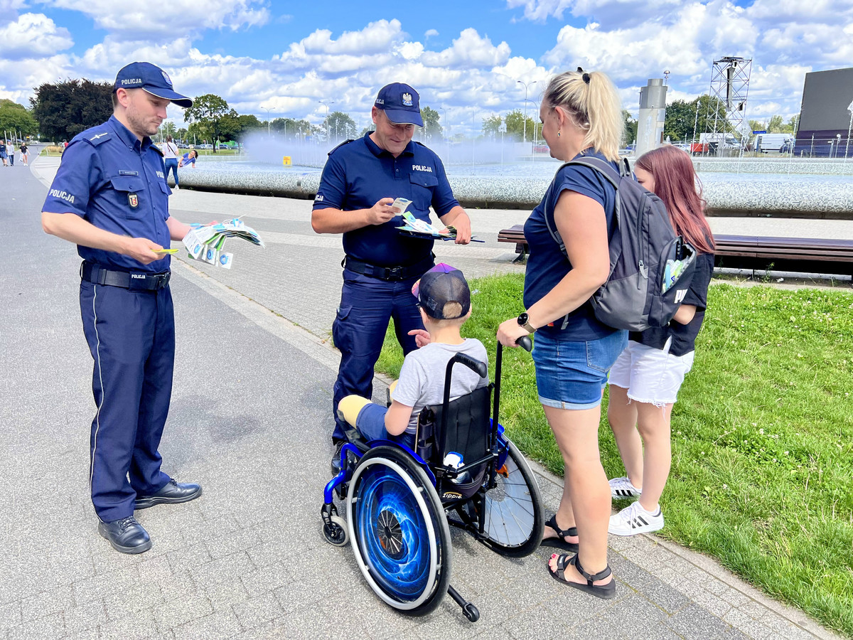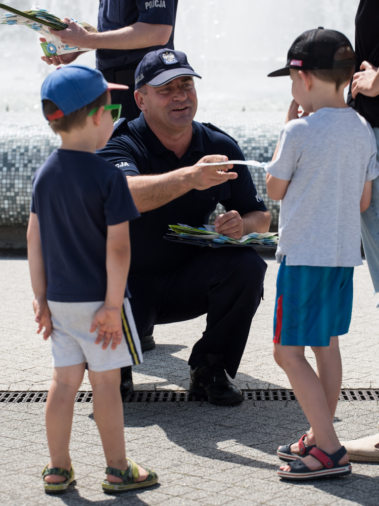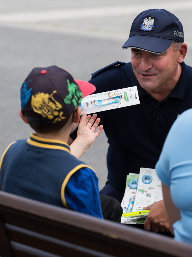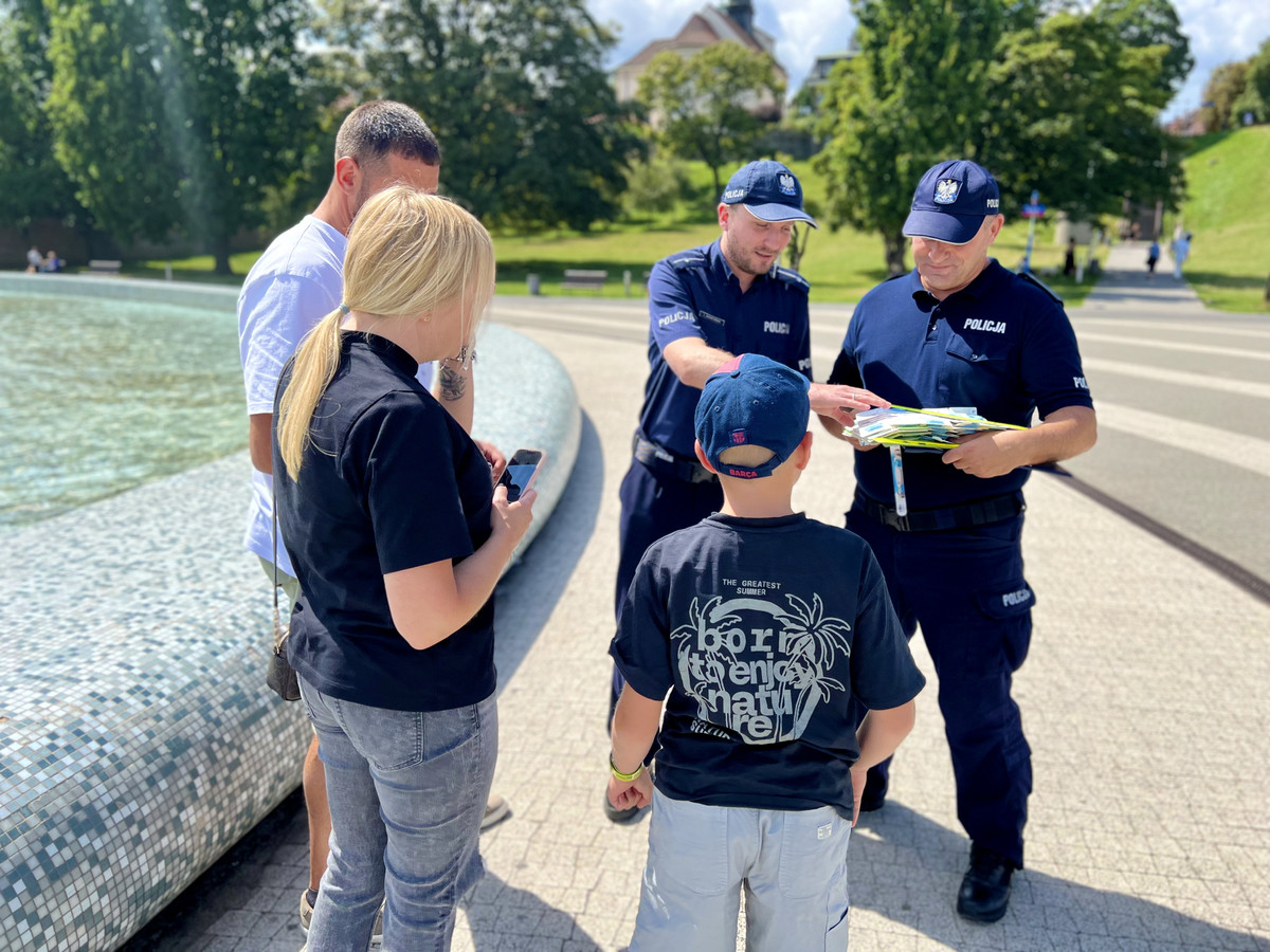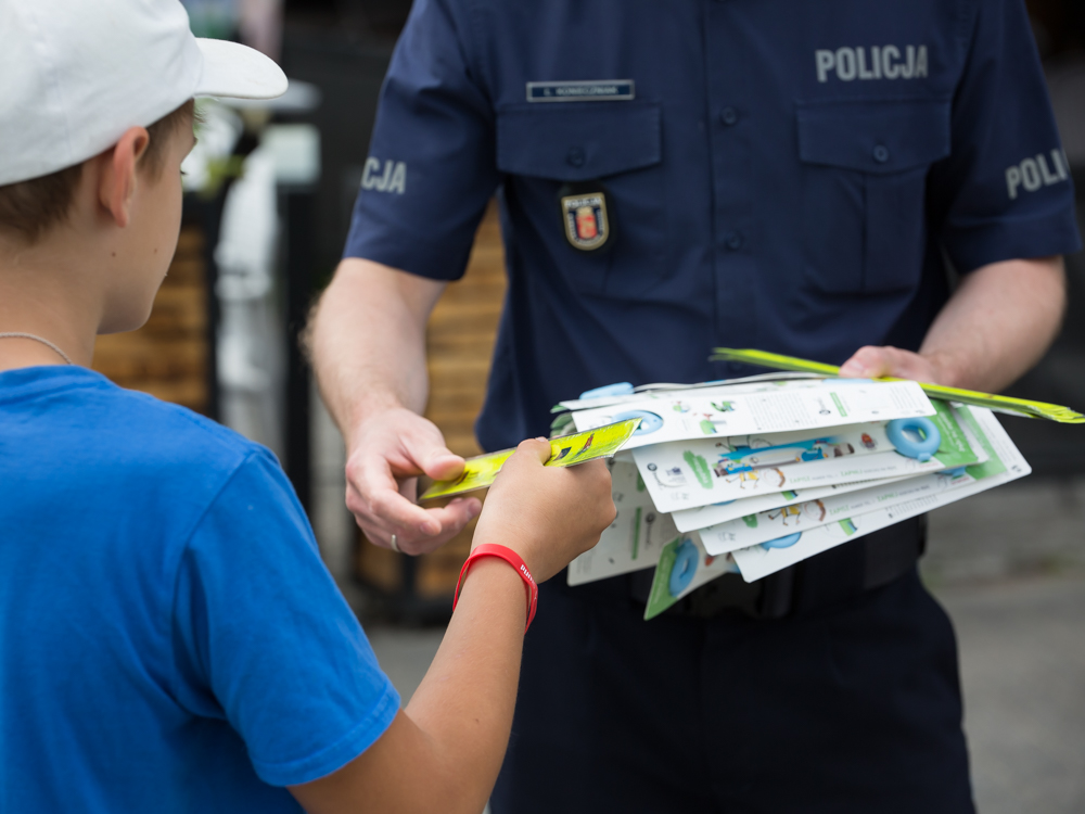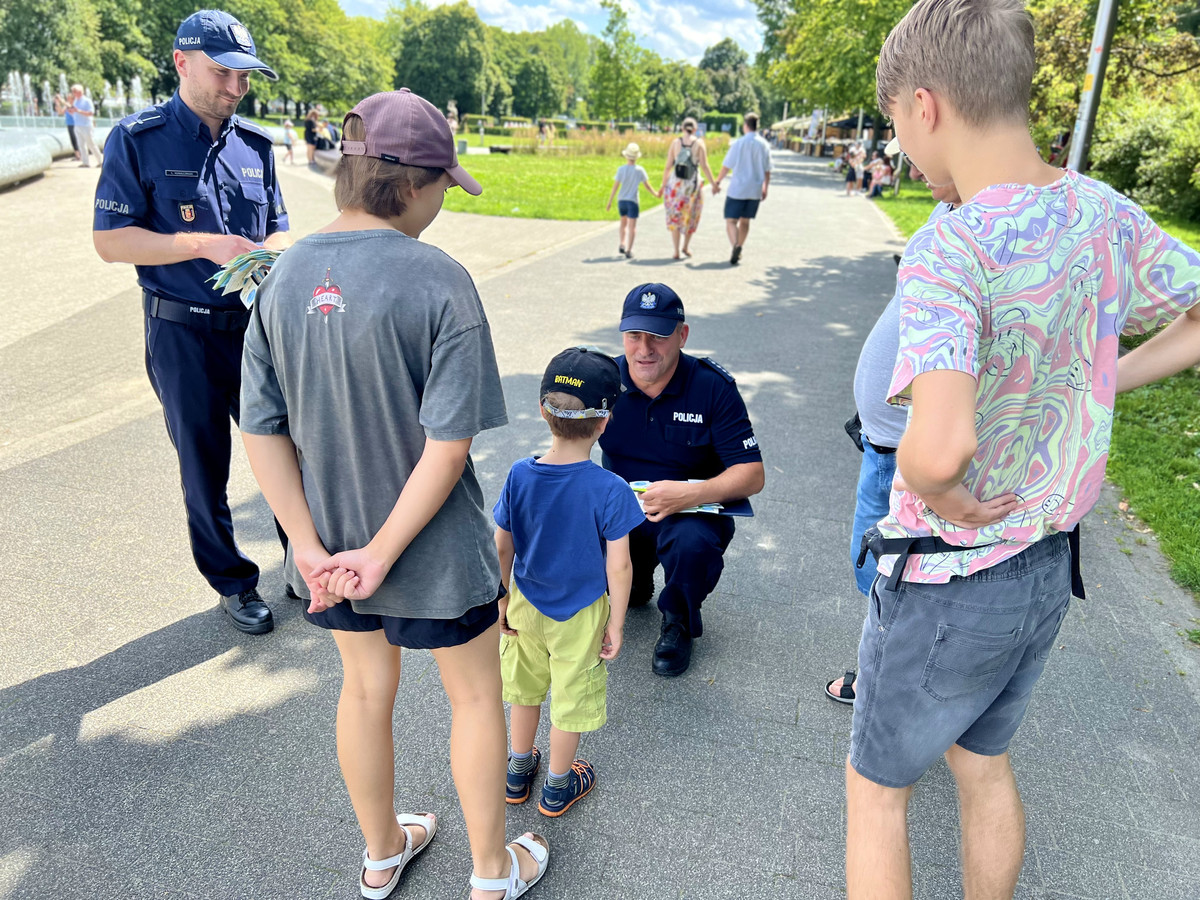 Od początku wakacji funkcjonariuszy można spotkać na placach zabaw, boiskach i w parkach. Spotykają się tam z dziećmi i ich rodzicami oraz młodzieżą, aby porozmawiać o tym, jak bezpiecznie spędzać wolny od nauki czas. W trakcie rozmów są omawiane podstawowe zasady bezpieczeństwa w tym ruchu drogowego, które powinien znać każdy jego uczestnik. Zachęcają najmłodszych do noszenia kasków i ochraniaczy podczas jazdy rowerem lub hulajnogą, noszenia elementów odbla-skowych, które znacznie poprawiają ich widoczność na drodze, a jednocześnie dają kierowcy szansę na wcześniejszą reakcję.