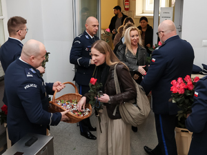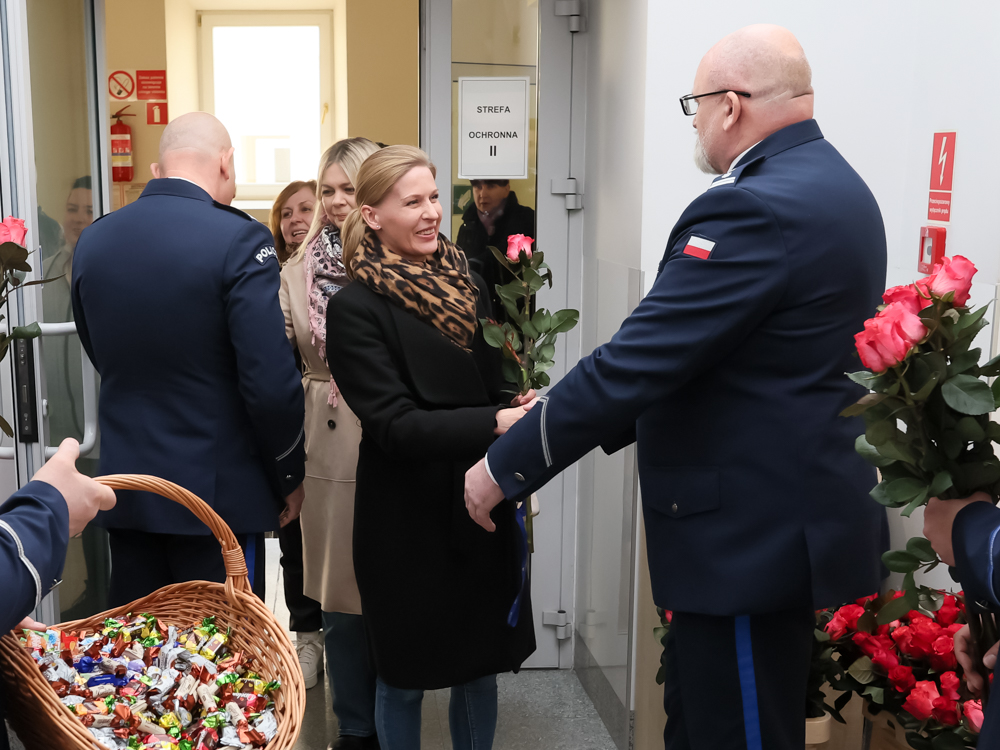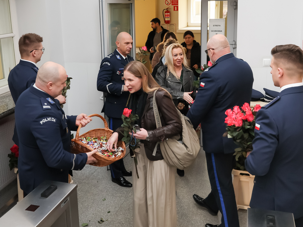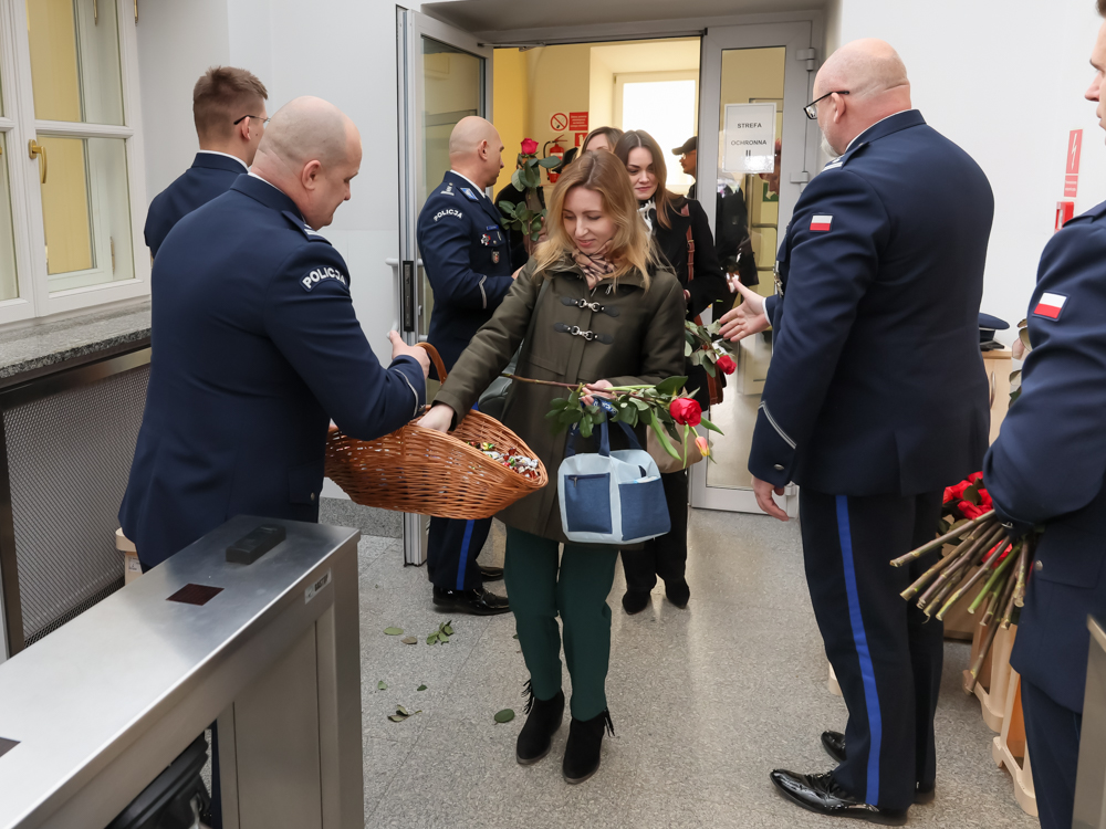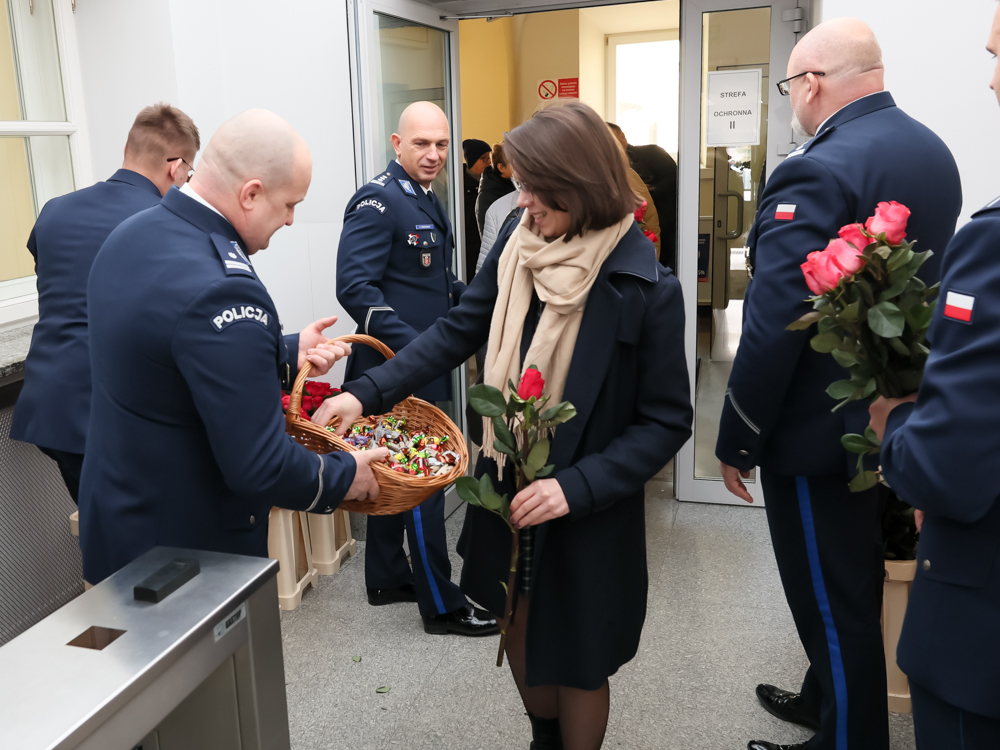 Komendanci w asyście policjantów z Kompanii Reprezentacyjnej Policji każdej kończącej dzisiaj pracę pracownicy i policjantce wręczali kwiaty i nie tylko, bo oprócz życzeń „Wszystkiego Najlepszego”, przygotowali również dla nich cukierki.