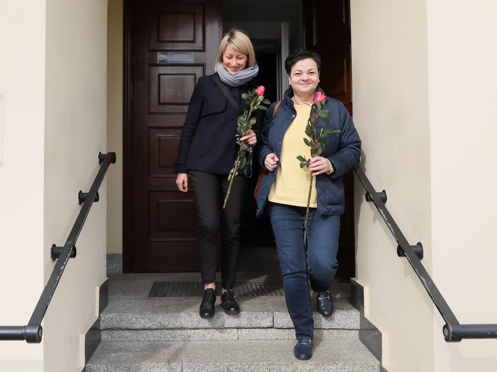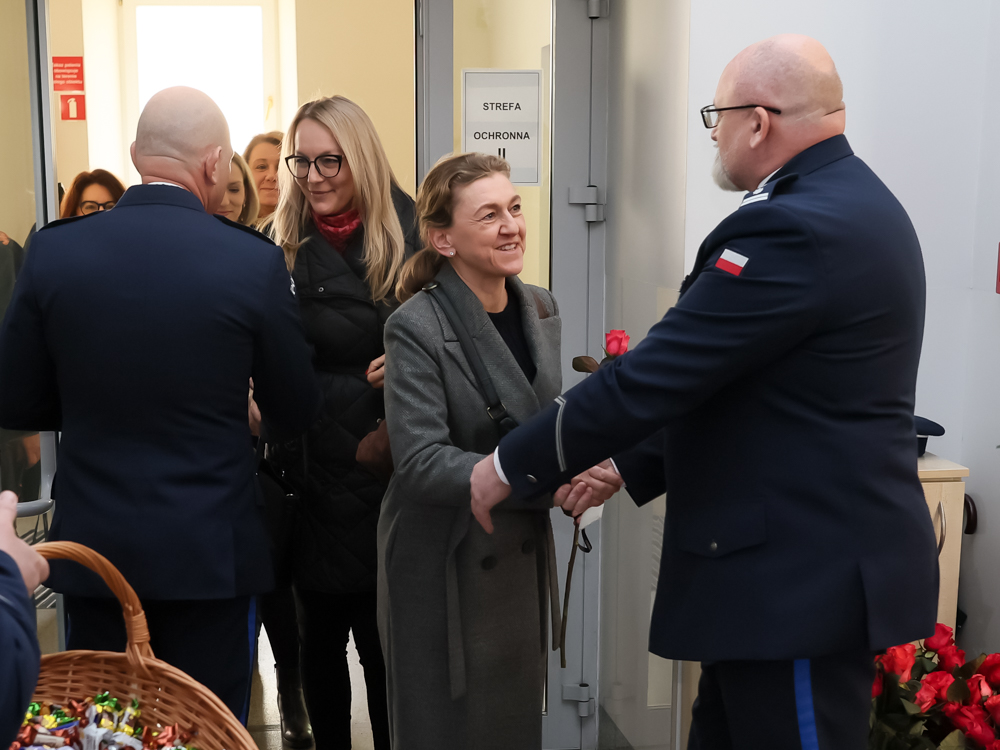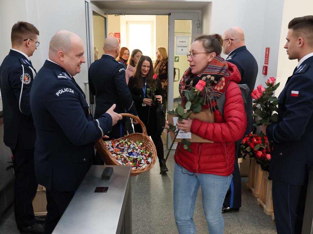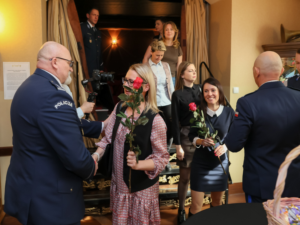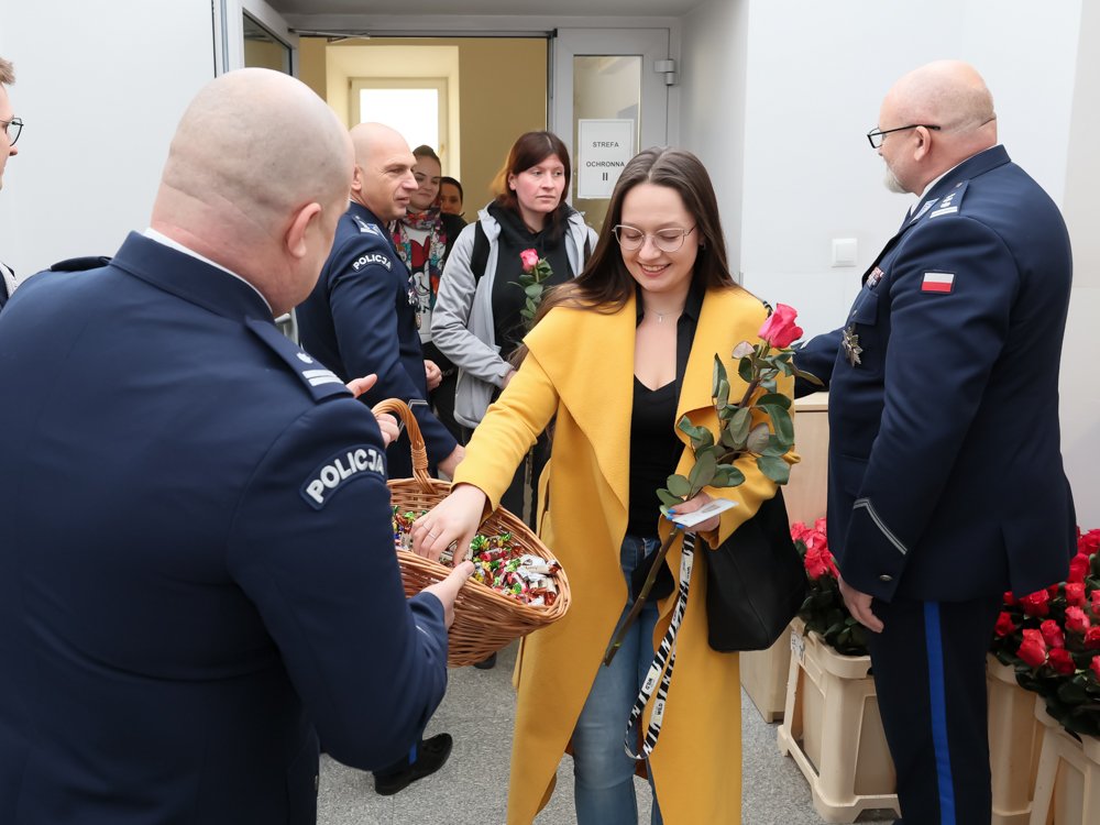 Komendanci w asyście policjantów z Kompanii Reprezentacyjnej Policji każdej kończącej dzisiaj pracę pracownicy i policjantce wręczali kwiaty i nie tylko, bo oprócz życzeń „Wszystkiego Najlepszego”, przygotowali również dla nich cukierki.