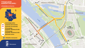 W niedzielę o godz. 16:00 z ruchu zostanie wyłączony most Świętokrzyski, a później także ulice w okolicach PGE Narodowego. W niedzielę w godzinach 14:00-19:00 na ulicy Wybrzeże Kościuszkowskie, w sąsiedztwie Centrum Nauki Kopernik, odbędzie się Piknik Tysiąclecia. O godzinie 18:30 została zaplanowana historyczna parada na moście Świętokrzyskim, a o godzinie 20:00 koncert na błoniach PGE Narodowego. Wydarzenie zakończy pokaz świetlny dronów. Ruch na most Świętokrzyski oraz ulice: Wybrzeże Szczecińskie, Siwca, Sokolą i Zamoście wróci około godziny 21:00.
