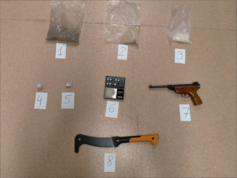 Policjanci wraz z 22-latkiem i pozostała dwójka udali się do zajmowanego przez nich mieszkania. Tam, w trakcie przeszukania, policjanci znaleźli i zabezpieczyli marihuanę i 4CMC, w sumie prawie 650 gramów. Ponadto w jednym z pomieszczeń funkcjonariusze natrafili na przedmioty przypominające broń palną oraz maczetę. Dodatkowo, na poczet przyszłych kar policjanci zabezpieczyli pieniądze w kwocie 8 tysięcy złotych.
