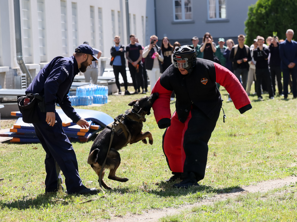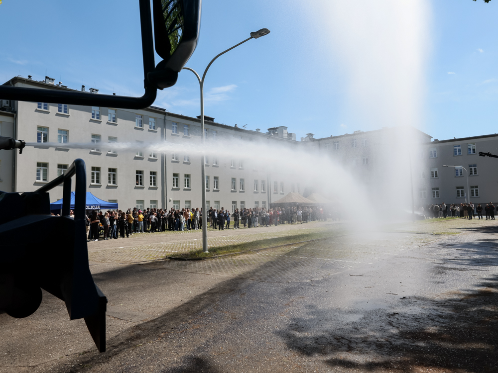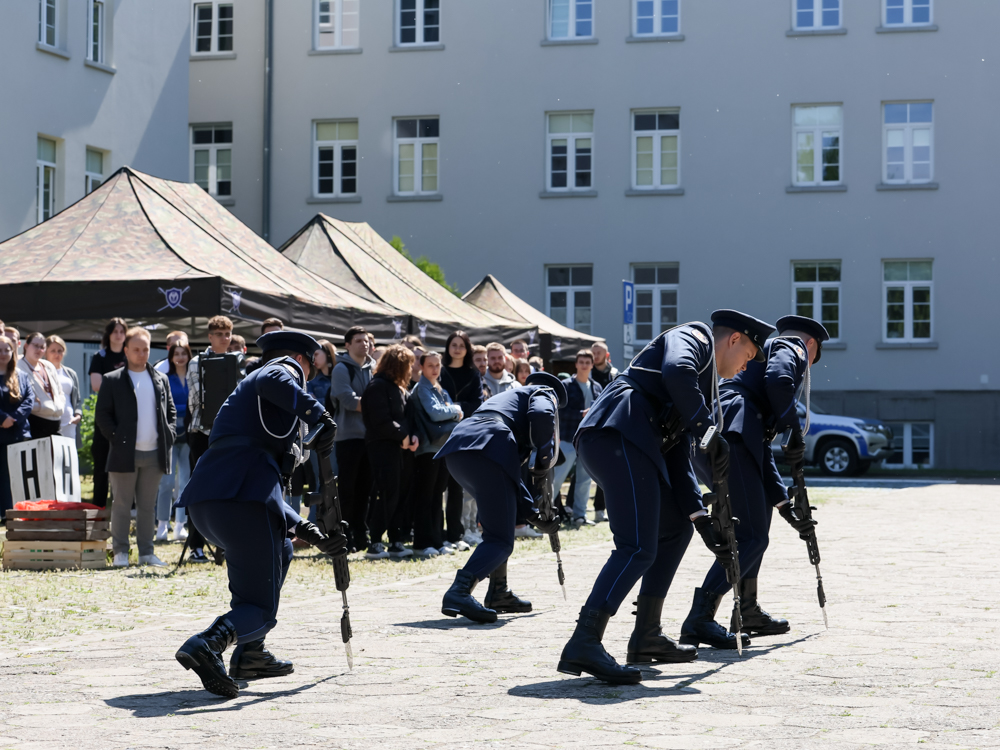 Pierwszą część wydarzenia rozpoczęły spektakularne pokazy Wydziału Doskonalenia Zawodowego KSP , gdzie pod kierunkiem mł. asp. Adriana Gieferta funkcjonariusze zaprezentowali techniki samoobrony i obezwładniania osób przy wykorzystaniu środków przymusu bezpośredniego. Kolejnym punktem programu był pokaz musztry paradnej przygotowanej przez kompanię reprezentacyjną Oddziału Prewencji Policji w Warszawie. Kolejno mogliśmy zobaczyć Wydział Ruchu Drogowego KSP, gdzie funkcjonariusze przedstawili pokaz kierowania ruchem drogowym. Duże zainteresowanie wzbudził Wydział Wywiadowczo – Patrolowy KSP – który zaprezentował wyszkolenie psów tropiących pod kierunkiem asp. Pawła Goźdź. Na koniec uczniowie mogli zobaczyć jak policjanci z Samodzielnego Pododdziału Kontrterrorystycznego Policji w Warszawie udzielają pierwszej pomocy osobie postrzelonej. Studenci zapoznali się z działaniami Laboratorium Kryminalistycznego i Dochodzeniowo – Śledczego KSP, mogli również poczuć się jak policjanci oddziału prewencji przymierzając ich sprzęt PZ, który jest wykorzystywany podczas różnego zabezpieczeń.