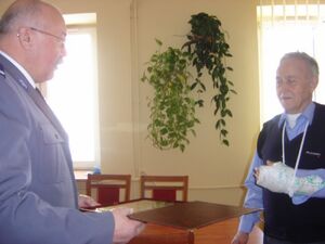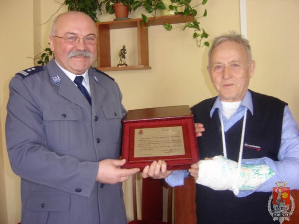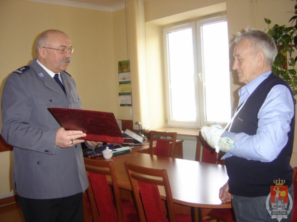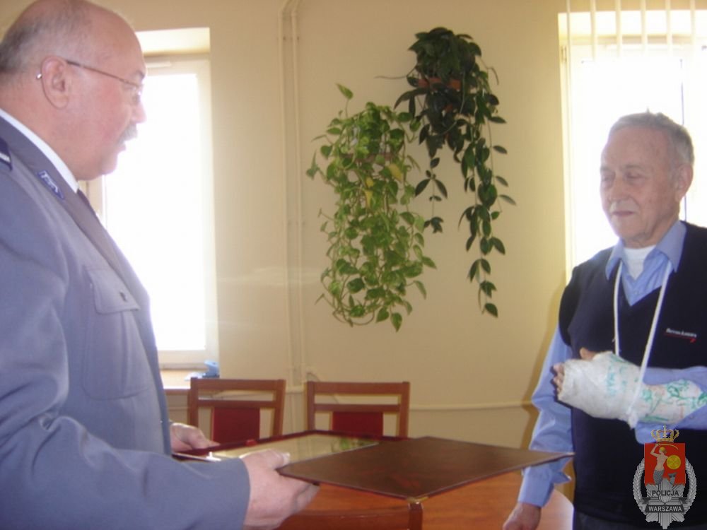 Dziś o 11.00 Komendant Rejonowy Policji Warszawa VII, mł. insp. Dariusz Pergoł gościł u siebie w gabinecie wyjątkowego człowieka. Pan Jerzy z Wawra stał się bohaterem w momencie, kiedy bez zawahania i zastanowienia, nie bacząc na zagrożenia, stanął na drodze uciekającego włamywacza. W ramach ogromnego uznania i podziękowania dla odwagi i prawdziwie obywatelskiej postawy Komendant Rejonowy w imieniu Komendanta Stołecznego Policji insp. Adama Mularza wręczył Panu Jerzemu pamiątkowy ryngraf.