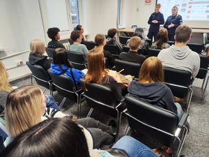 W pierwszej części spotkania podkom. Irmina Retmaniak i mł. asp. Karolina Latuszek zaprezentowały szerokie spektrum działań Policji oraz omówiły korzyści wynikające z pełnienia służby w garnizonie stołecznym. Uczestnicy poznali zasady rekrutacji, etapy postępowania kwalifikacyjnego oraz wymagania stawiane kandydatom. Policjantki podkreśliły również możliwości rozwoju zawodowego, bogatą ofertę szkoleń, specjalistycznych kursów oraz ścieżek awansu.