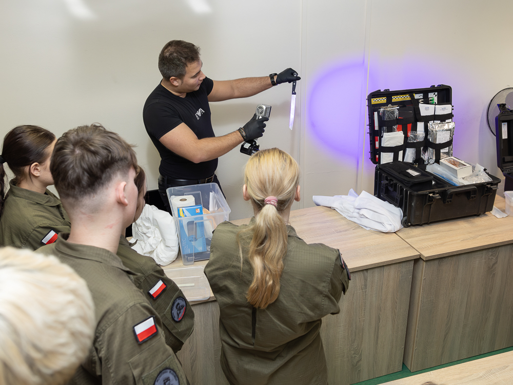 Następnie funkcjonariusz Laboratorium Kryminalistycznego zaprezentował techniki ujawniania, zbierania oraz zabezpieczania śladów kryminalistycznych. Uczestnicy spotkania mieli również okazję samodzielnie wykonać pamiątkowe odciski palców, co spotkało