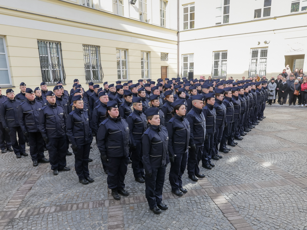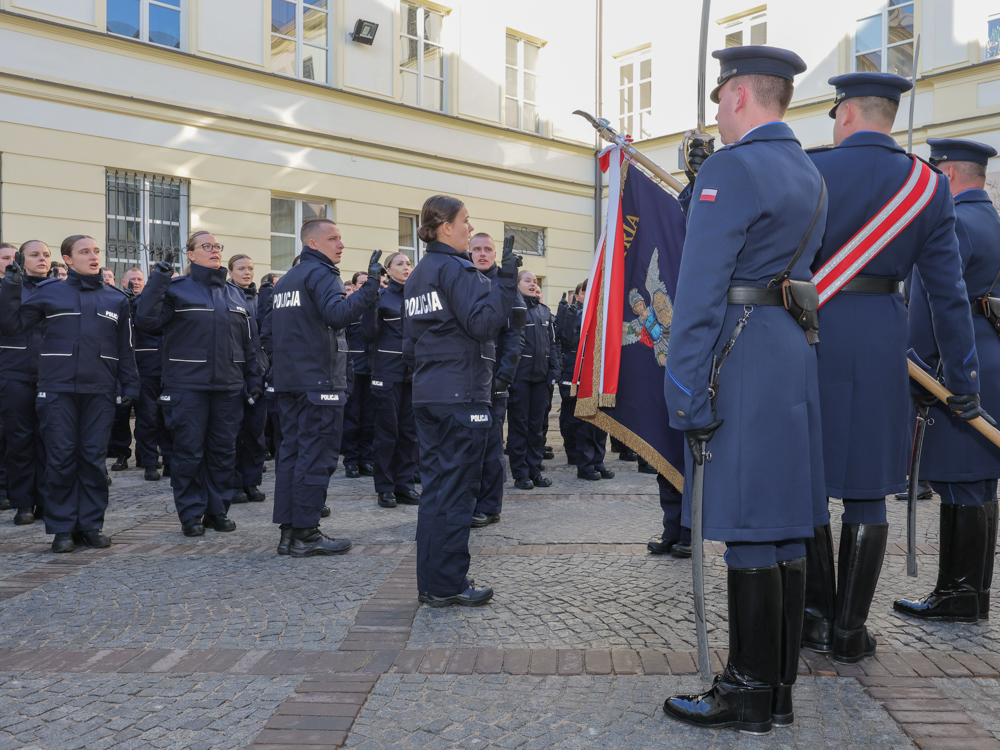 95 nowych policjantów za Komendantem Stołecznym Policji mł. insp. dr. Krzysztofem Ogrońskim przed Konstytucją Rzeczypospolitej Polskiej oraz sztandarem Komendy Stołecznej Policji złożyło dziś uroczystą przysięgę, ślubując „… służyć wiernie narodowi, chronić ustanowiony Konstytucją Rzeczpospolitej Polskiej porządek prawny, strzec bezpieczeństwa Państwa i jego obywateli, nawet z narażeniem życia (…) pilnie przestrzegać prawa, dochować wierności konstytucyjnym organom RP, przestrzegać dyscypliny służbowej oraz wykonywać rozkazy i polecenia przełożonych (…) strzec tajemnic związanych ze służbą, honoru, godności i dobrego imienia służby oraz przestrzegać zasad etyki zawodowej (…)”. Uroczysta zbiórka z okazji ślubowania odbyła się na dziedzińcu Komendy Stołecznej Policji.