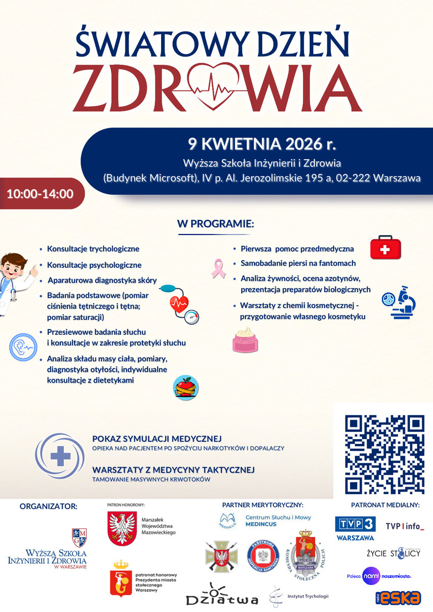 Komenda Stołeczna Policji jest partnerem organizowanego przez Wyższą Szkołę Inżynierii i Zdrowia Światowego Dnia Zdrowia. 9 kwietnia w siedzibie szkoły przy Al. Jerozolimskich zaplanowano między innymi konsultacje, podstawowe badania, pokazy symulacji medycznej oraz warsztaty z medycyny taktycznej. Osoby zainteresowane udziałem w obchodach Światowego Dnia Zdrowia będą mogły skorzystać z konsultacji w godzinach 10.00 - 14.00.