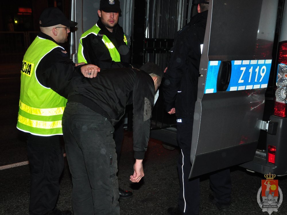 Kilka minut później pod wskazanym adresem było już kilkanaście radiowozów, karetka pogotowia. Na miejsce wezwano również przewodnika z psem tropiącym do wyszukiwania narkotyków. Łącznie zatrzymano do wyjaśnienia 58 mężczyzn, w większości obywateli Czeczenii. Podczas kontroli mężczyzn zabezpieczono nielegalną broń „TT”, 2 pałki teleskopowe, 10 scyzoryków składanych, 2 noże i dwa telefony komórkowe (jeden pochodzący z kradzieży na Ochocie, drugi z rozboju na Pradze Północ).