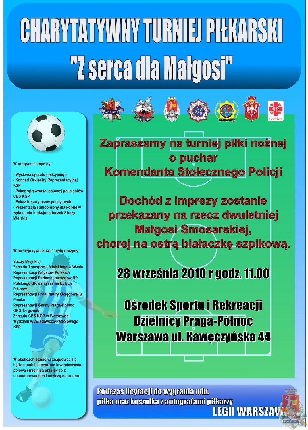 To prawdopodobnie najważniejszy mecz sezonu! Zapraszamy na turniej piłki nożnej o puchar Komendanta Stołecznego Policji, z którego dochód zostanie przekazany na rzecz dwuletniej Małgosi Smosarskiej, chorej na ostrą białaczkę szpikową. Podczas imprezy odbędą się licytacje z cennymi nagrodami – między innymi: koszulki reprezentanta Polski w piłce siatkowej Pawła Zagumnego, piłki i koszulki z autografami piłkarzy Legii Warszawa oraz wizyty w salonie SPA.