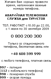 Wishing you a pleasant stay, may we remind you of the important telephone numbers TOURIST EMERGENCY LINE "TEL" LINES OPEN - between 10 a.m. and 10 p.m.,from 1st June to 30th September 2009 0 800 200 300 LAND LINE - FREEPHONE ACCESS +48 608 599 999 LAND LINE OR MOBILE NETWORK, CALL CHARGES APPLY 997 - POLICE |