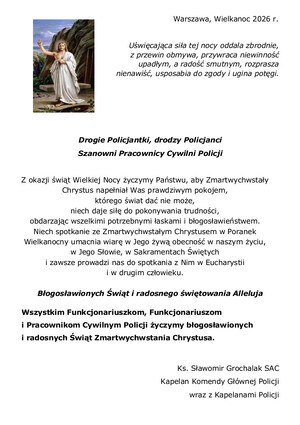 Dnia 17 listopada br. w Bazylice św. Krzyża w Warszawie odbędzie się modlitwa w intencji zmarłych Policjantów, Pracowników Cywilnych, a także zmarłych z ich rodzin. O godz. 15.40 w wypominkach zostaną odczytane imiona tych, którzy odeszli do wieczności, natomiast o 16.00 w ich intencji ksiądz kapelan KSP odprawi Mszę świętą. (Imiona zmarłych można zgłaszać na adres mailowy: kuziel@interia.pl; w pokoju Kapelana 069; poprzez sms na nr 723 314 861).