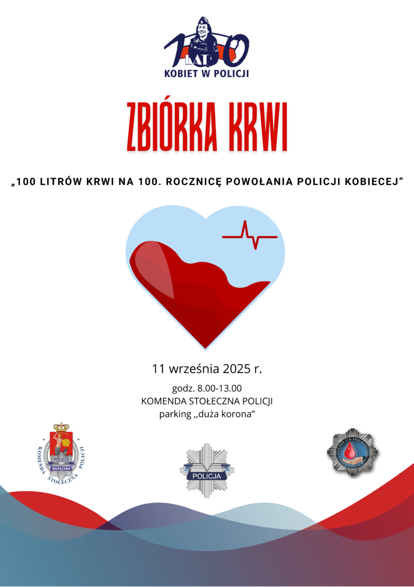 Zbiórka krwi odbędzie się tradycyjnie przed budynkiem Komendy Stołecznej Policji przy ul. Nowolipie 2 w Warszawie, w godzinach 8:00-13:00, dnia 11 września 2025 roku. Jednocześnie informujemy, że osoby, które nie będą mogły osobiście uczestniczyć w organizowanych zbiórkach, mogą oddać krew w dowolnym centrum krwiodawstwa na hasło „100 LAT KOBIET W POLICJI”, które należy przekazać na etapie rejestracji. Dzięki temu każdy będzie miał możliwość włączenia się w obchody jubileuszu, niezależnie od miejsca, w którym zdecyduje się oddać krew.
