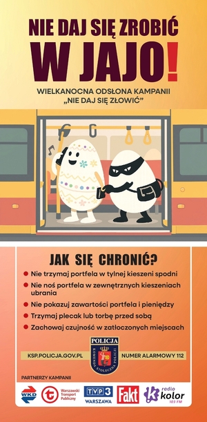 Rozpoczynamy kampanię informacyjną mającą podnieść świadomość mieszkańców stolicy oraz wszystkich odwiedzających Warszawę w okresie poprzedzającym Wielkanoc. Zgodnie z hasłem medialnej akcji, apelujemy – „NIE DAJ SIĘ ZROBIĆ W JAJO!”. Działania mają na celu przeciwdziałanie kradzieżom kieszonkowym w środkach komunikacji publicznej, galeriach handlowych, bazarach oraz innych miejscach handlu i usług. W kampanię zaangażowali się policjanci z Wydziału Wywiadowczo-Patrolowego KSP, którzy z przestępczością kieszonkową walczą już od wielu lat. Przygotowaliśmy również spot filmowy i ulotki informujące o zagrożeniu.