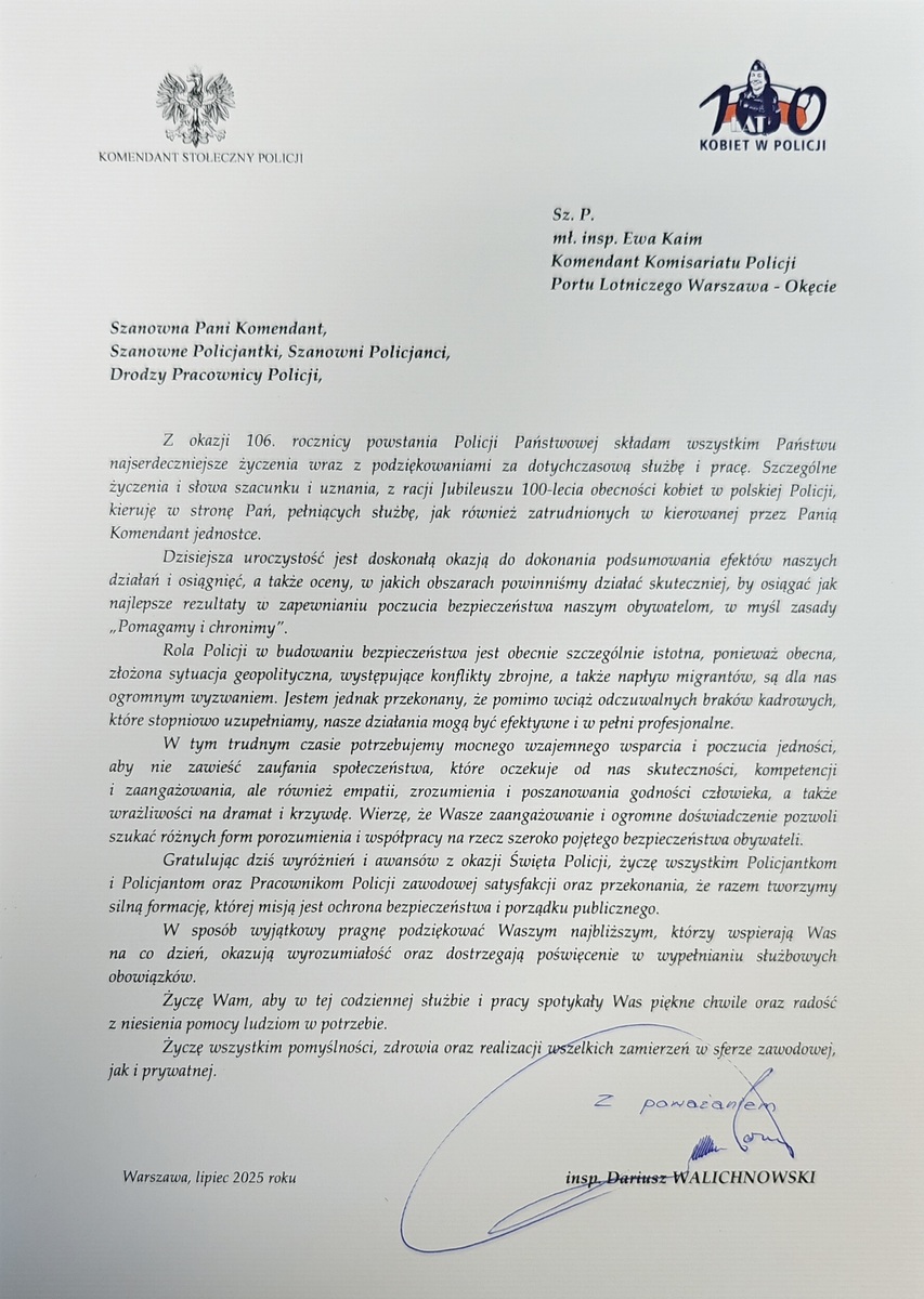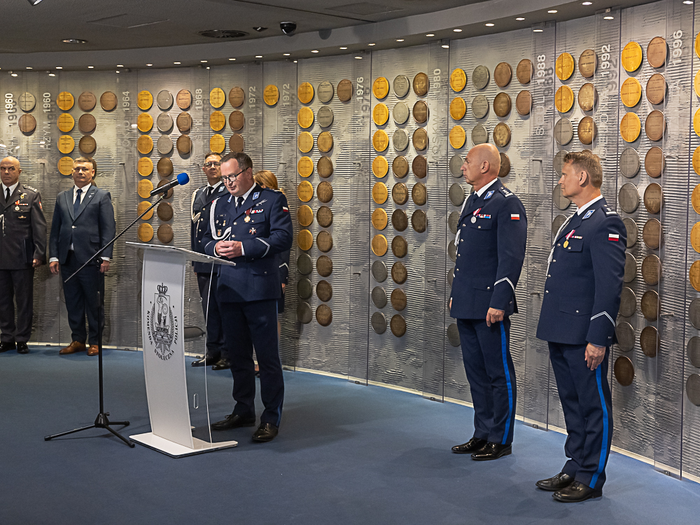Po wręczonych odznaczeniach głos zabrał Zastępca Komendanta Stołecznego Policji inspektor Robert Frąckowiak. W swoim przemówieniu podziękował wszystkim policjantom za codzienną, wymagającą służbę oraz pogratulował awansów. Podkreślił, że obecny rok jest jubileuszowy przypadający w 106 rocznicę powstania Policji Państwowej oraz 100 rocznicę powstania policji kobiecej. Przekazał również na ręce Komendantów Komisariatów Specjalistycznych listy Komendanta Stołecznego Policji insp. Dariusza Walichnowskiego z życzeniami oraz podziękowaniami za dotychczasową służbę i pracę dla policjantek, policjantów i pracowników tych jednostek.