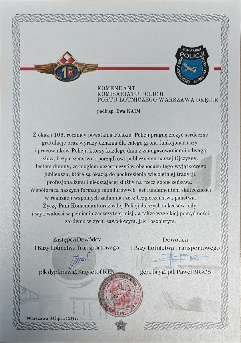 Podczas uroczystości Zastępca Dowódcy 1. Bazy Lotnictwa Transportowego pułkownik Krzysztof Bień złożył w imieniu dowództwa jednostki na ręce Komendant Komisariatu Policji Portu Lotniczego Warszawa Okęcie młodszego inspektora Ewy Kaim serdeczne gratulacje oraz wyrazy uznania dla całego grona funkcjonariuszy i pracowników Policji.