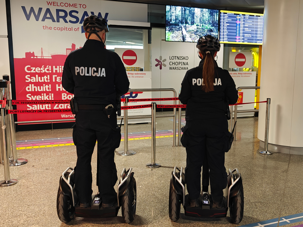 Na Lotnisku Chopina w Warszawie pojawiły się policyjne patrole, które ponownie poruszają się na pojazdach typu Segway. Urządzenia zasilane są z akumulatorów, pochylenie się użytkownika powoduje ruch w danym kierunku. Dotychczasowe doświadczenia pokazują, że wykorzystanie takich pojazdów poprawia efektywność realizowanych działań. Pełniąc służę w tym samym wymiarze czasu policjanci mogą dotrzeć do większej liczby miejsc.