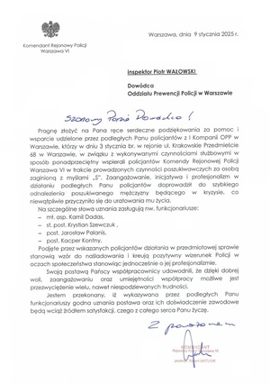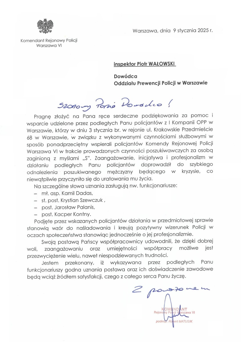 Podziękowanie od Komendanta Rejonowego Policji Warszawa VI Powrót Drukuj Do Oddziału Prewencji Policji w Warszawie wpłynęło podziękowanie od Komendanta Rejonowego Policji Warszawa VI.