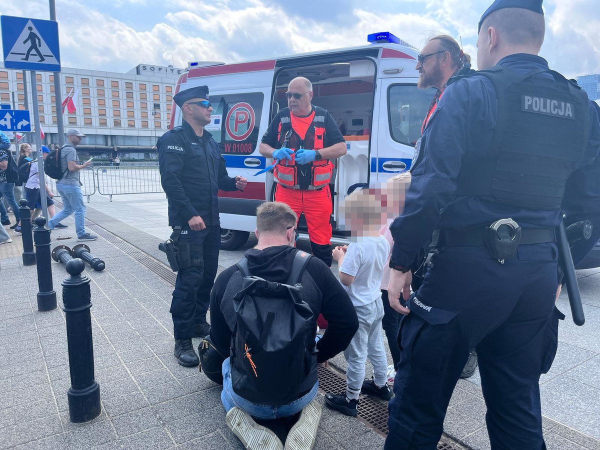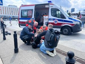 Funkcjonariusze 3 Kompanii Oddziału Prewencji Policji w Warszawie udzielili pomocy kobiecie, która przewróciła się, niosąc na rękach dziecko.