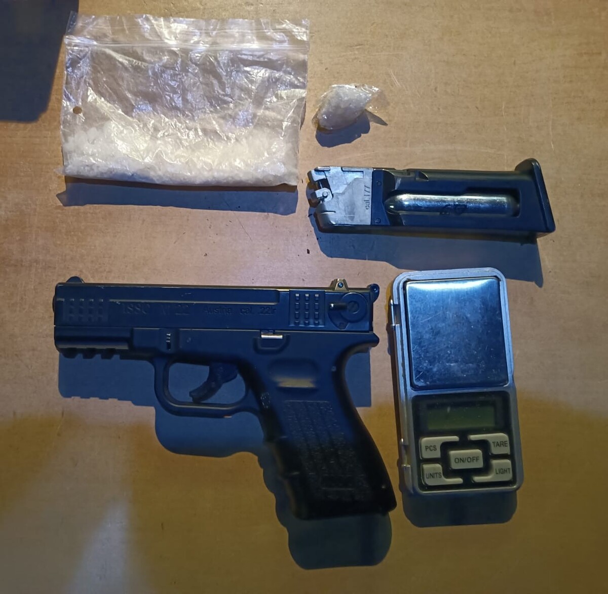 Podczas interwencji okazało się, że mężczyzna ukrywał się przed wymiarem sprawiedliwości i był poszukiwany przez policjantów z Kielc. W trakcie dalszych czynności funkcjonariusze ujawnili przy nim foliowy worek z białą substancją, wagę elektroniczną oraz pistolet gazowy.