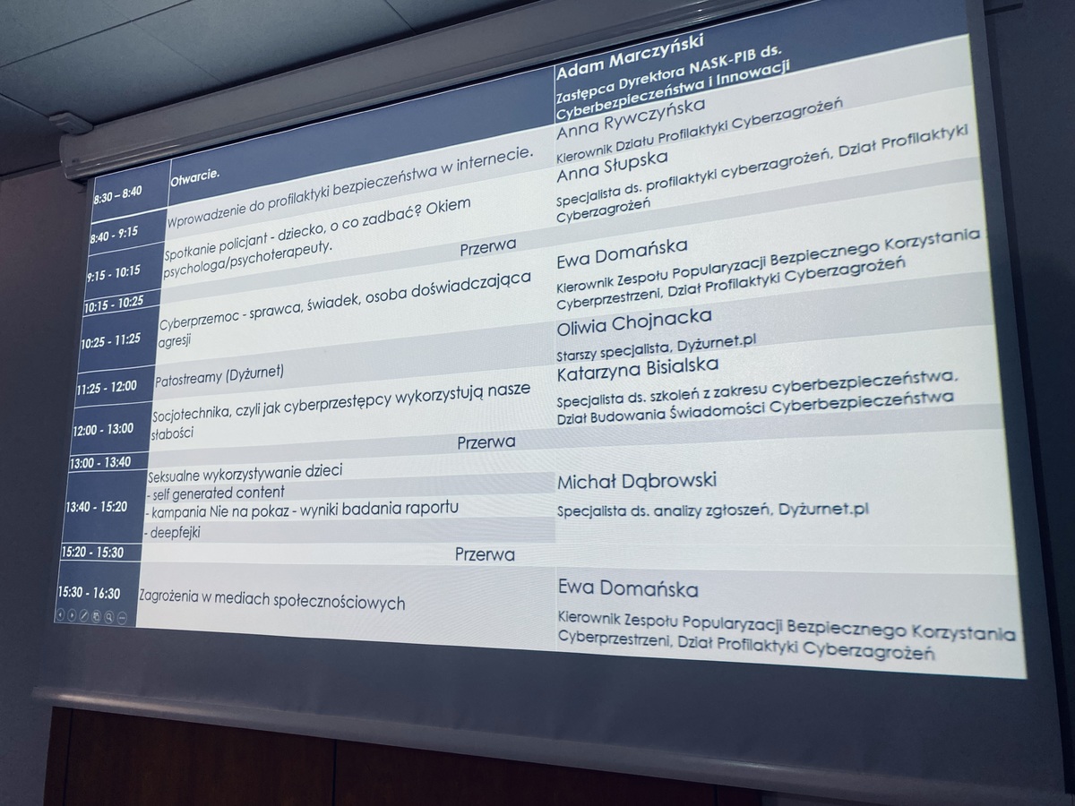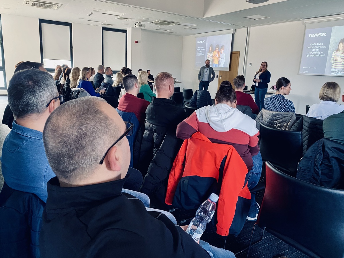 W dniu 21 marca 2024 r. w siedzibie NASK w Warszawie odbyło się szkolenie skierowane do funkcjonariuszy garnizonu stołecznego, którzy na co dzień pracują z dziećmi i młodzieżą. Specjaliści ds. profilaktyki, specjaliści ds. nieletnich oraz oficerowie prasowi wzbogaceni zostali o dodatkową wiedzę. Spotkanie było doskonałą okazją do wymiany doświadczeń i dobrych praktyk w kontaktach z szeroko rozumianym bezpieczeństwem dzieci i młodzieży, a także początkiem rozmów – jak możemy działać razem.