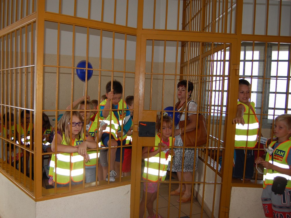 Dzieci obejrzały także policyjny "areszt” – oczywiście z tej dobrej strony choć przez chwilę zostały „zamknięte” za kratami. Po wyjściu „na wolność” każde stwierdziło, że pobyt w takim „pokoju” to nic przyjemnego. Funkcjonariusz zaprezentował także radiowóz, a nasi mali goście mogli w nim usiąść i zobaczyć jak włączyć tak głośną policyjną syrenę.