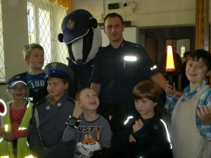 Niecodzienny patrol policjantów odwiedził dzieci ze Szkoły Podstawowej w Dziekanowie Leśnym. Podczas spotkań dzielnicowy wspólnie z Borsukiem poprzez wspólną zabawę przedstawili dzieciom zawód policjanta oraz zasady prawidłowego i bezpiecznego poruszania się po drogach. Dzieci wspaniale bawiły się również podczas projekcji filmu "Bezpieczna droga z radami SpongeBoba", który mogły obejrzeć z ogromną policyjną maskotką.