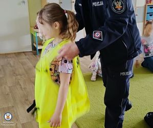 Funkcjonariusz w trakcie zajęć przedstawił przedszkolakom elementy wyposażenia policyjnego, które wzbudziły zainteresowanie.
