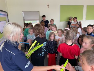 Aby dodatkowo zadbać o bezpieczeństwo najmłodszych uczestników ruchu drogowego, policjanci wręczają dzieciom odblaski. Dzięki nim będą lepiej widoczne na drodze po zmroku, co znacząco zwiększa ich bezpieczeństwo.