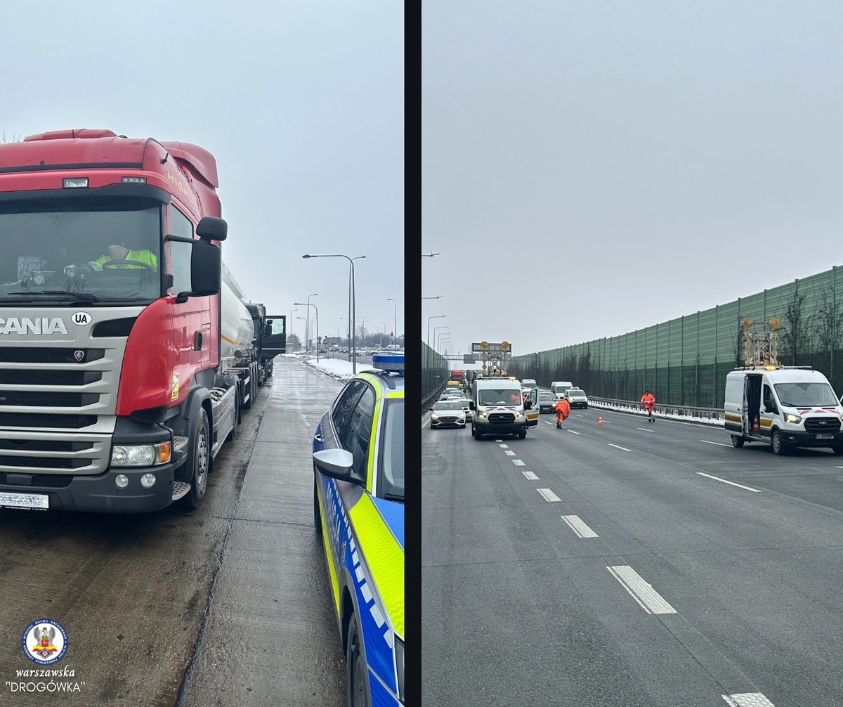 Przewozili materiały niebezpieczne trasą S2 i utknęli przed tunelem POW. Szybka reakcja służb zapobiegła zagrożeniu