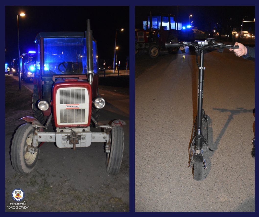 Do zdarzenia doszło w ubiegłym tygodniu na drodze bocznej przylegającej do ulicy Drewny w Warszawie. Kierujący ciągnikiem rolniczym z przyczepą poruszał się w tym samym kierunku co dwaj 14-latkowie, którzy wspólnie poruszali się na jednej hulajnodze elektrycznej.