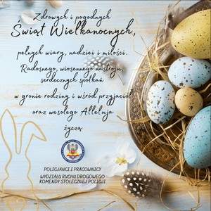 Zdrowych i pogodnych Świąt Wielkanocnych, pełnych wiary, nadziei i miłości. Radosnego, wiosennego nastroju, serdecznych spotkań w gronie rodziny i przyjaciół oraz Wesołego Alleluja życzą policjanci i pracownicy Wydziału Ruchu Drogowego Komendy Stołecznej Policji
