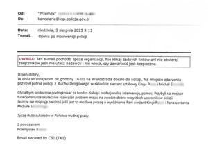 Podziękowania skierowane do policjantów warszawskiej „drogówki” od uczestnika zdarzenia drogowego